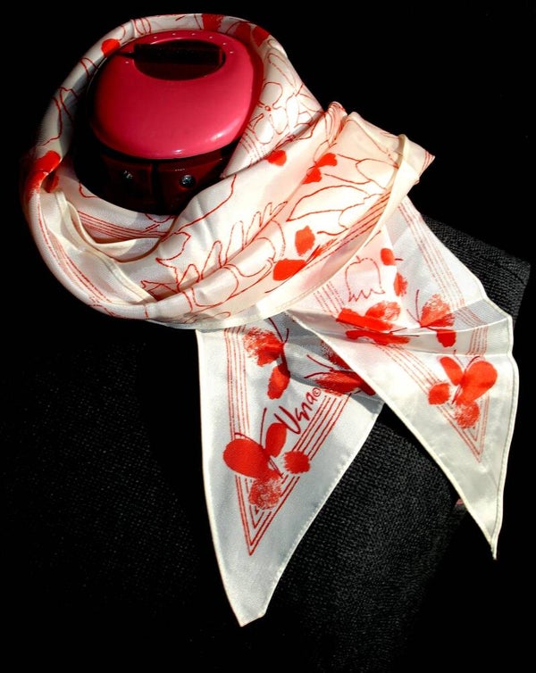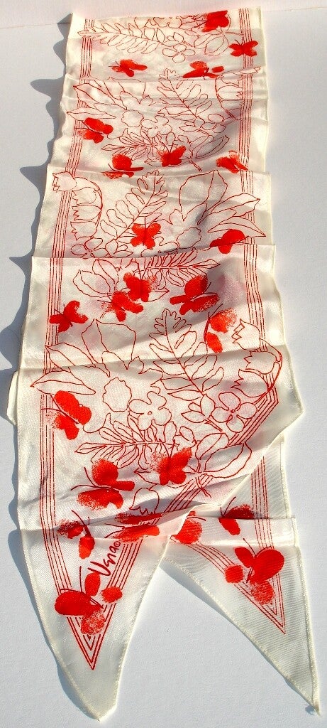 This Vera Neumann floral design with orange butterflies pointed end scarf features a white background with outlined floral designs in orange punctuated with abundant solid orange colored butterflies. Vera's butterfly patterns are among the most collectable.