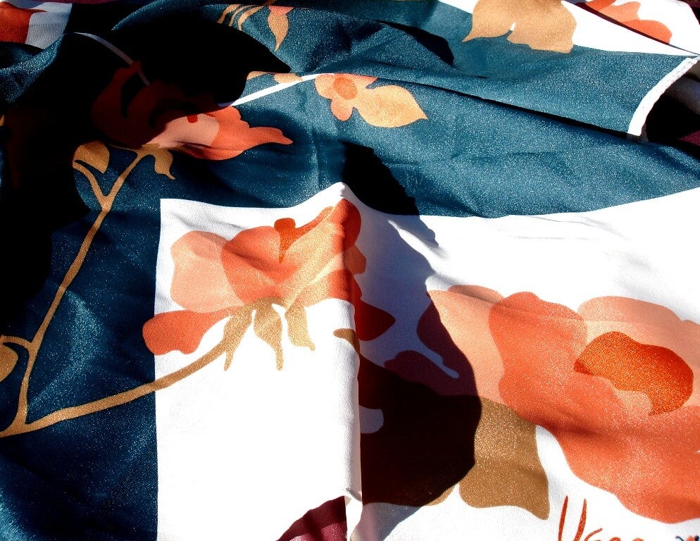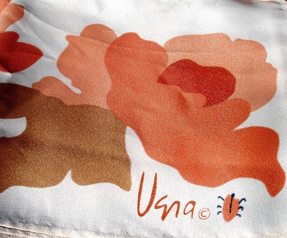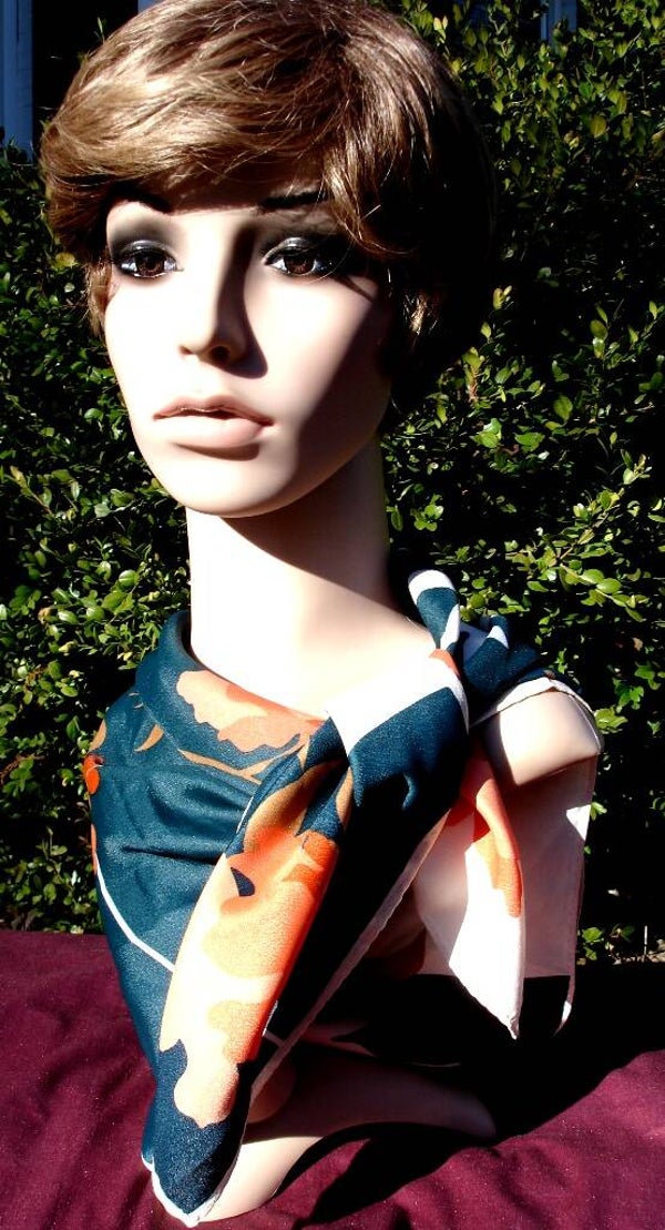 This absolutely gorgeous Vera Neumann green, white with brown, rust and peach flowers scarf is in excellent condition! It is one of her "mod" floral designs. As pictured it is signed Vera with the copyright design and ladybug symbol which dates this scarf in the early 1960's.