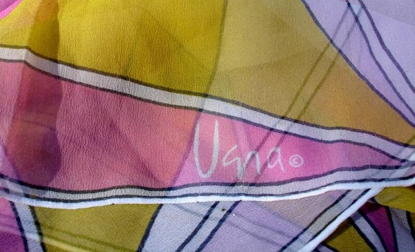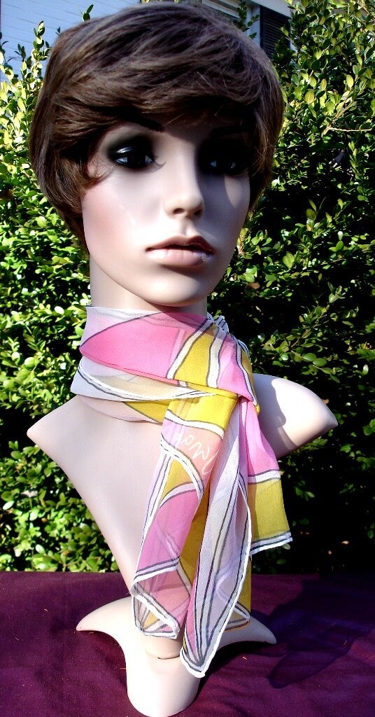 This absolutely gorgeous Vera Neumann Gold Pink White Triangles Geometric Sheer Vintage Scarf is in excellent condition! It is from Vera's "mod" designs collection. As pictured it is signed Vera with the copyright design which dates it in the 1970's.