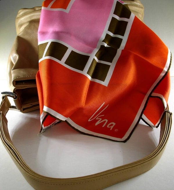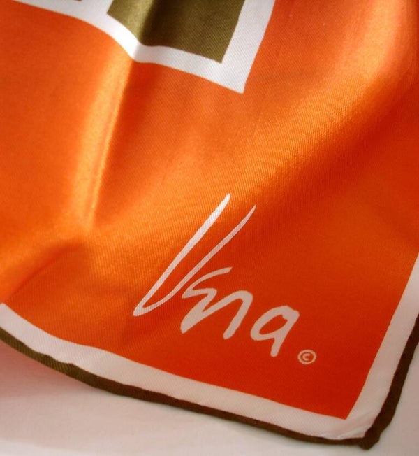 scarf, vintage scarf, Vera designer scarf, Vera mod scarf, Vera Neumann, orange, brown, pink, white, mosaic design scarf, Vera scarf, 1980s, Vera Neumann, Vera Neumann designer scarf, Two Artisan Sisters,