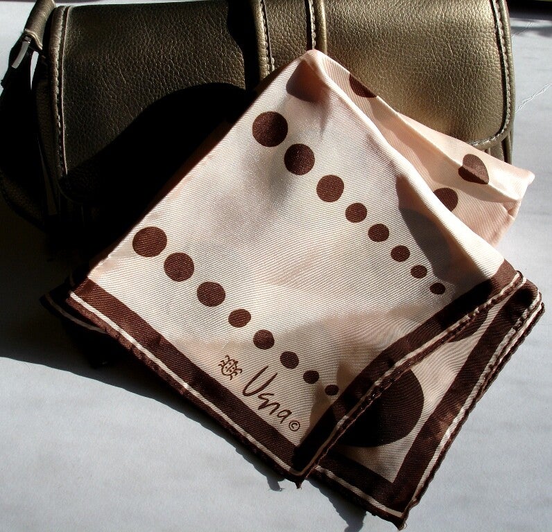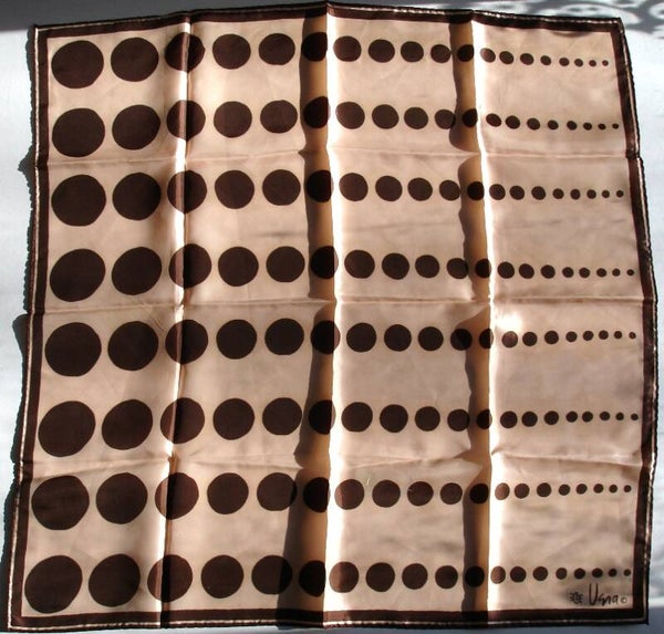 This lovely Vera scarf has a very light brown background with rows of dark brown polka dots in graduated sizes from large down to small and it is in excellent condition as it only has three very tiny pale pink marks which I think is probably lipstick (see photo 4 above) and one very small dent in the fabric which is not visible unless you hold the scarf up to a bright light and look through it to find the flaw.
