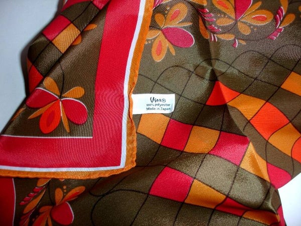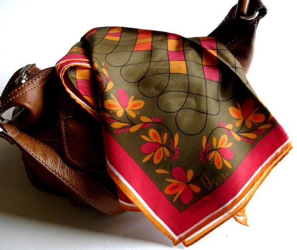 scarf, vintage scarf, vintage designer scarf, Vera Neumann scarf, floral design scarf, geometric design scarf, red, orange, gold, olive green, 1970s, Vera designer scarf, Vera Neumann designer scarf, Two Artisan Sisters,