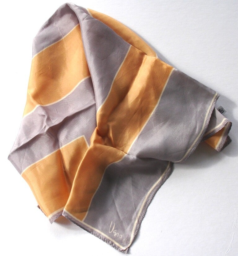 scarf, vintage scarf, vintage designer scarf, Vera Neumann scarf, Vera Neumann designer scarf, 1970s, gray, rusty gold, white, geometric print scarf, ladies fashion accessory, women's fashion accessory, square scarf, hand rolled hem, Two Artisan Sisters,