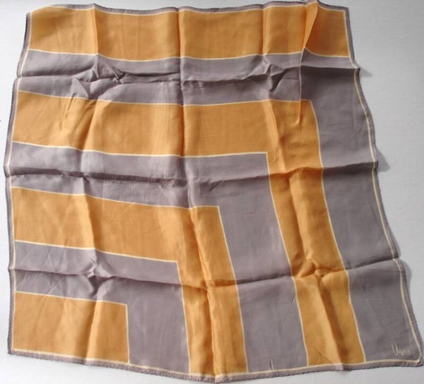 This lovely Vera scarf dates from the 1970s and features a striking mod geometric design in V shaped blocks of light gray and a light rusty shade of gold separated by thin white stripes.