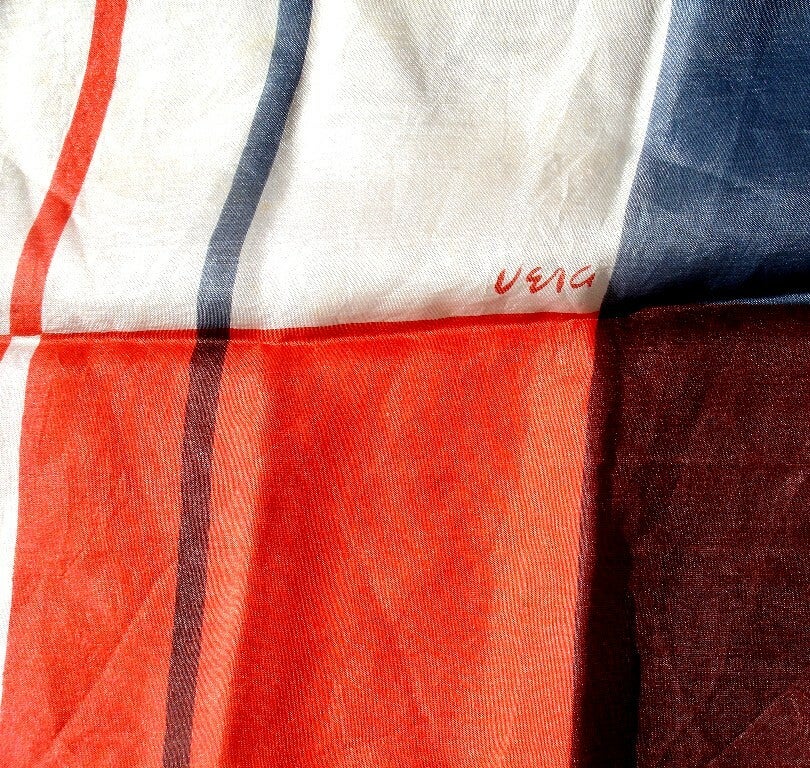 These scarves were made by Vera before she had a copyright and before she started using the ladybug in her signature. The Vera signature is very small in size and does not appear on the corner of the scarf but up further within the geometric design. Finding a lovely pre copyright Vera scarf of this size and in this great of condition is truly rare as these scarves a becoming extremely hard to find.