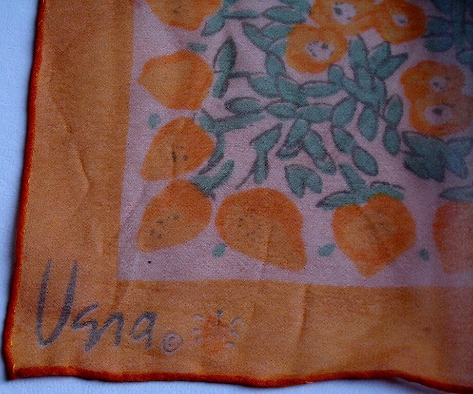 Vera's talent for painting nature and flowers is once again evident in this beautiful Verasheer scarf. This remarkable scarf has a handrolled hem in yellow which matches the wide border around the outside of the scarf. The background is is very light peach with the yellow and peach flowers and blossoms as well as the green leaves which are in the center area of the scarf.