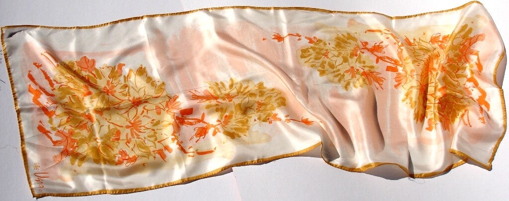 This is a long rectangular scarf that measure approximately 14" x 44" in length and has a handrolled hem in gold color. The orange and gold floral pattern is spread across the length of the scarf with washes of peach and light yellow in the background.