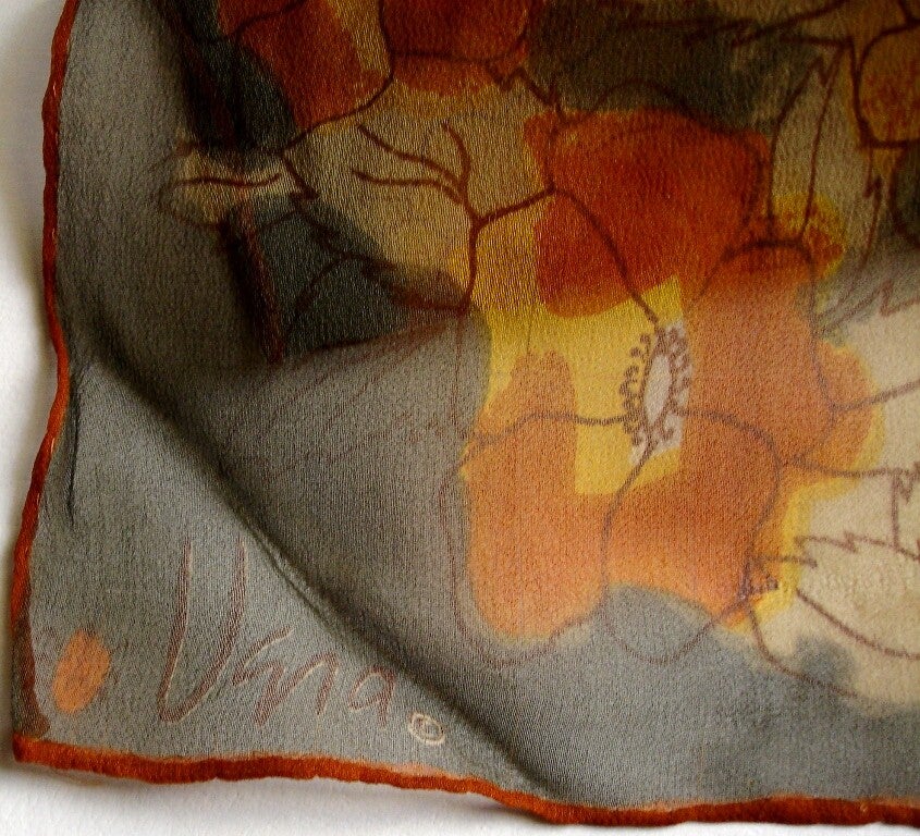 scarf, vintage scarf, vintage designer scarf, vintage Vera ladybug scarf, Vera Neumann, Vera Neumann designer scarf, Verasheer, rectangular scarf, gray, rust, gold, brown, stylized pansies, 1960's, Two Artisan Sisters,