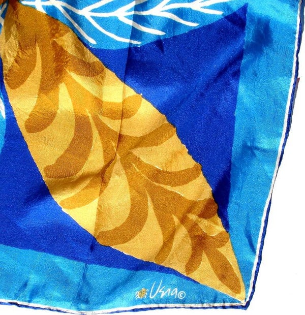 Shades of blue background Vera scarf features mod stylized large leaves in gold with brown vein accents and blue with white vein accents. Scarf has a thin border accent of white and a dark blue handrolled hem. This lovely scarf also has the much sought after ladybug symbol along with Vera's signature.