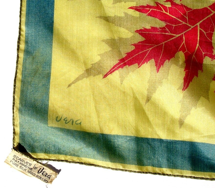 scarf, vintage scarf, vintage designer scarf, Vera scarf, Vera parachute silk scarf, World War II parachute silk, late 1940s, Vera signed scarf, Vera Neumann, Vera Neumann designer scarf, Vera designer scarf, teal green, red leaf, acorn, Two Artisan Sisters,