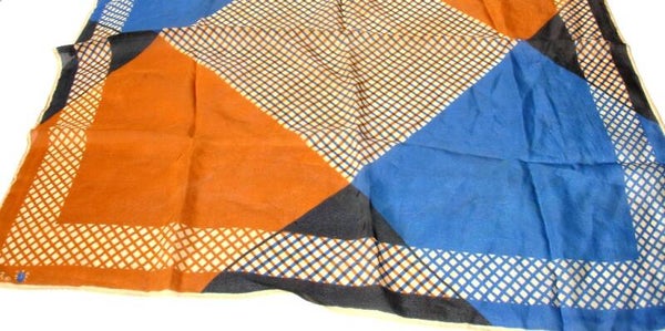 This Vera Neumann Geometric Blue Brown Navy And Off White Vintage Scarf features an off white rolled hem with criss crossing blocks of dark navy, brown and bright blue with a surrounding border and center of lattice featuring the same colors.