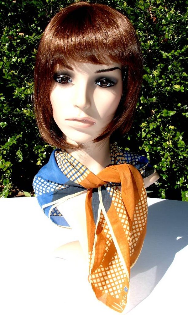 scarf, vintage scarf, vintage designer scarf, Vera signed scarf, Vera Neumann, Vera Neumann designer scarf, geometric design scarf, blue, brown, navy, off white, 1960's, ladybug scarf, Vera ladybug scarf, Two Artisan Sisters,