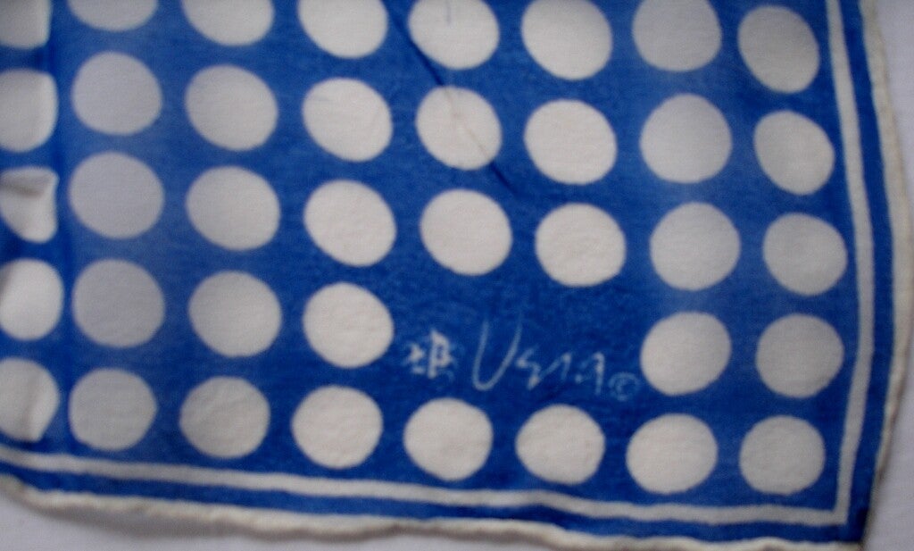 This beautiful square Vera Neumann vintage scarf is in excellent condition! Its a lovely blue and white polka dot geometric pattern. The background is a medium blue color with white polka dots of various sizes. The polka dots start out being small in the center of the scarf and grow in size as they radiate out to the handrolled hem. This will make a wonderful wardrobe accessory. Scarf dates to the 1960s and measures approximately 20 x20 in size and has the ladybug symbol. It has a rolled hem. I could find no tears, pulls or pin holes.