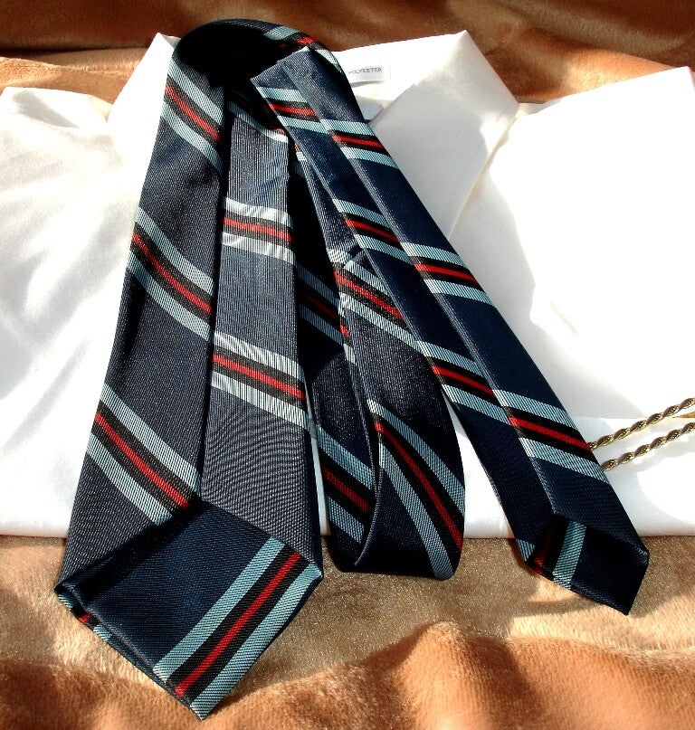 This vintage men's tie in dark navy blue with light blue and red stripes does not have its label with has a silky feel and texture. Tie measures 53" in length and 3-1/2" across at its widest point and has no stains, pulls or tears, only some minor wrinkling in the area where the knot would have been made.