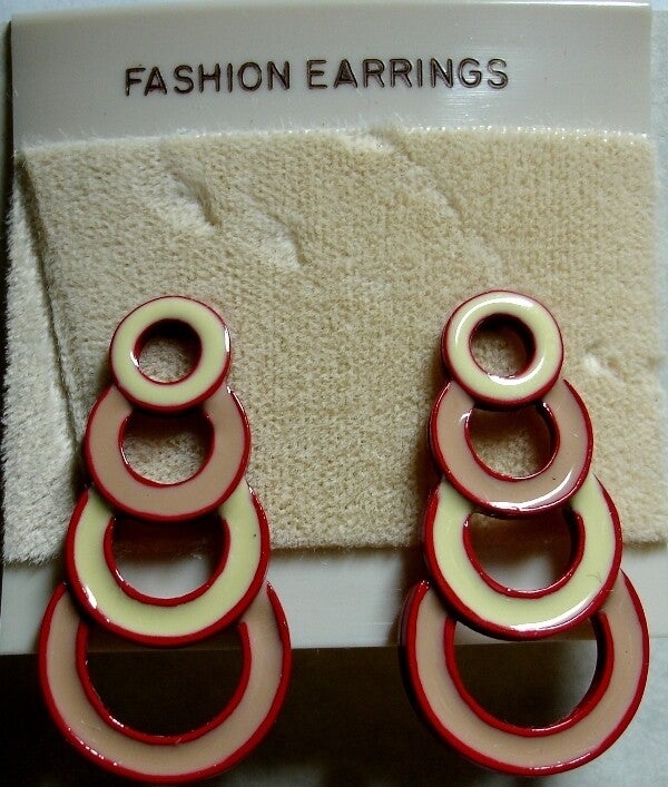 earrings, vintage earrings, vintage pierced earrings, surgical steel post earrings, cranberry red and cream earrings, decending circle earrings, pierced earrings, 1970s, mod design earrings, ladies fashion earrings, women's fashion earrings, statement earrings, Two Artisan Sisters,