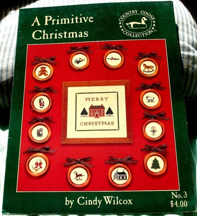This cross stitch chart A Primitive Christmas by Cindy Wilcox for Country Goose Collection was copyrighted in 1984 and includes: