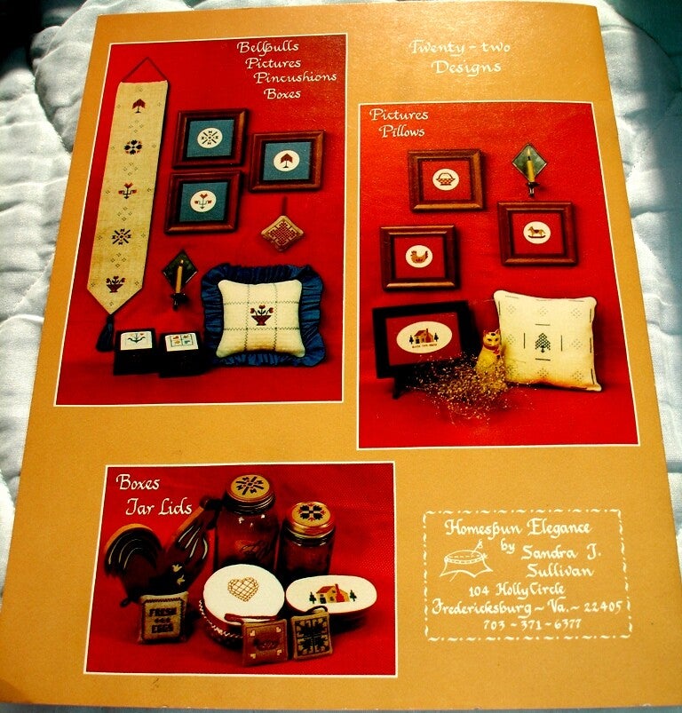 cross stitch chart, cross stitch graph, cross stitch pattern, Patches Of Country II For Christmas & all Year, Homespun Elegance, Sandra J. Sullivan, bellpulls, pictures, pillows, pin cushions, boxes, jar lids, copyright 1982, 22 counted cross stitch designs, Two Artisan Sisters,