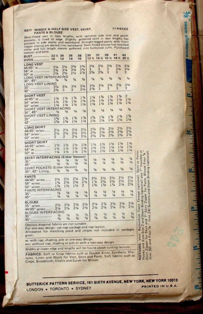 This Butterick 6877 Vest Skirt And Blouse Wardrobe pattern will ship USPS First Class with tracking.
