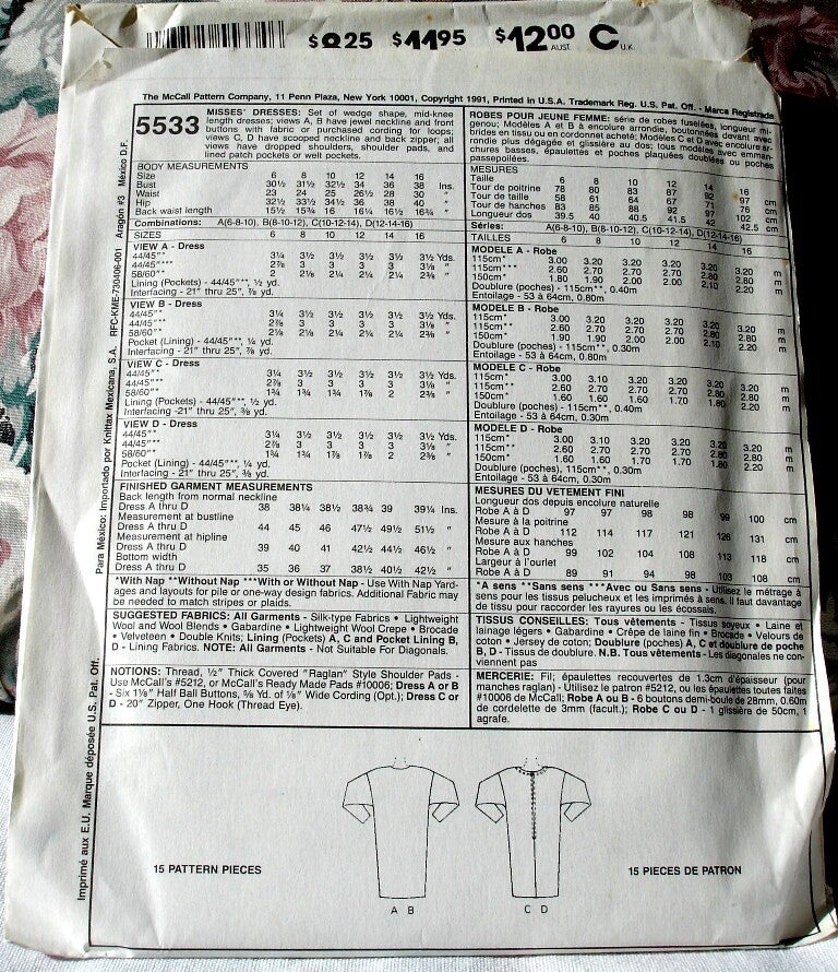 This McCall's 5533 misses Dresses pattern is uncut and factory folded and the envelope is in very good condition considering its age. Pattern was copyrighted in 1991.