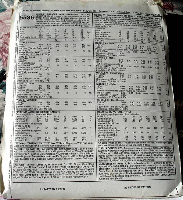 This McCall's 5536 pattern is uncut and factory folded and envelopes are in very good condition considering their age. Copyright on this pattern is 1991.