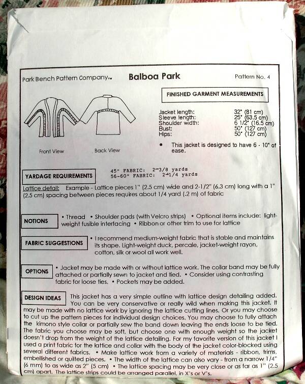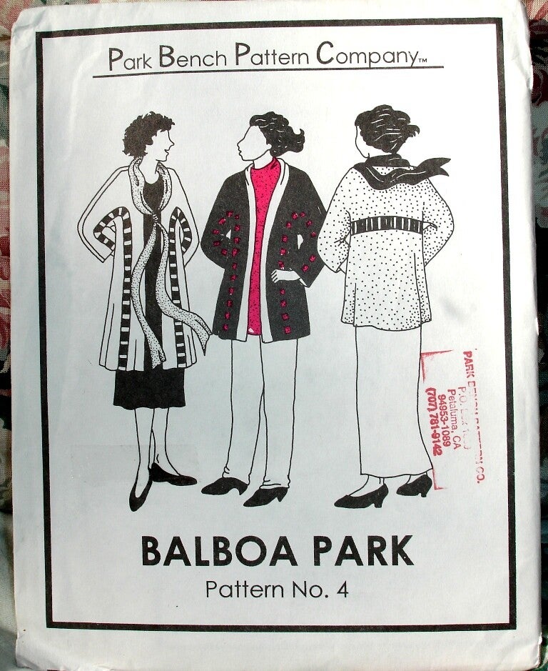 sewing pattern, Park Bench Pattern Company, Balboa Park Pattern No. 4., jacket, kimono style collar, lattice design detail, pockets, shoulder pads, collar band partially sewn leaving ends to be tied, wildly imaginative, ladies jacket, women's jacket, vintage style jacket, copyright 1995, Two Artisan Sisters,