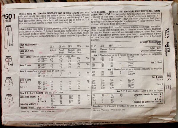 sewing pattern, Simplicity 7501, men's and teen boys pattern, misses jams pattern, easy to sew pattern, jams, side seam pockets, cording drawstring, Bermuda length, long length, short length, patch pockets, copyright 1986, Two Artisan Sisters,