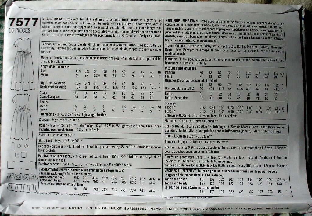 Simplicity 7577 pattern was copyrighted in 1997 and contains 16 pieces that are uncut and factory folded along with the instruction sheets.