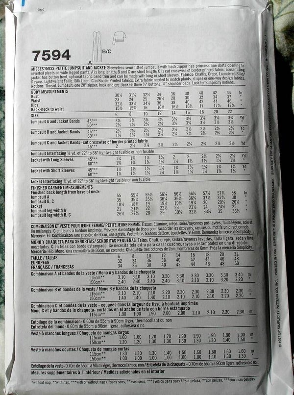 sewing pattern, Simplicity 7594, misses jumpsuit, misses jacket, sleeveless semi-fitted jumpsuit, back zipper, princess line parts, inverted pleats on wide legged pants, long length pants jumpsuit, short length pants jumpsuit, loose fitting jacket with front button closure, short sleeves, long sleeves, Two Artisan Sisters,