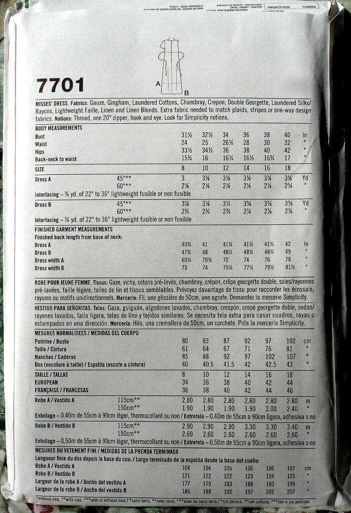 sewing pattern, Simplicity 7701, misses dress, princess seamed bodice top, sleeveless, short sleeves, tie back, maxi length gathered skirt, knee length gathered skirt, zippered back, copyright 1997, Size A fits 8-18, ladies spring/summer dress, women's spring/summer dress, Two Artisan Sisters,