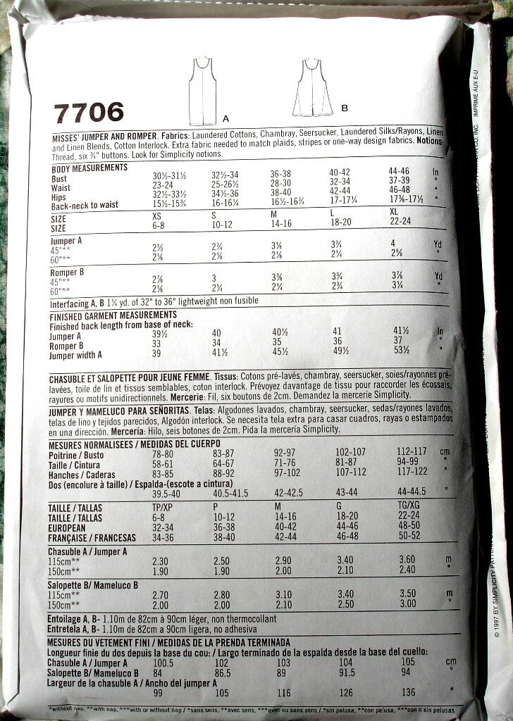 sewing pattern, Simplicity 7706, Size A makes from XS to XL, jumper, romper, shoulder buttoned jumper, shoulder buttoned romper, side button jumper, side buttoned romper, patch pockets, knee length jumper, knee length romper, ladies jumper, ladies romper, Two Artisan Sisters,
