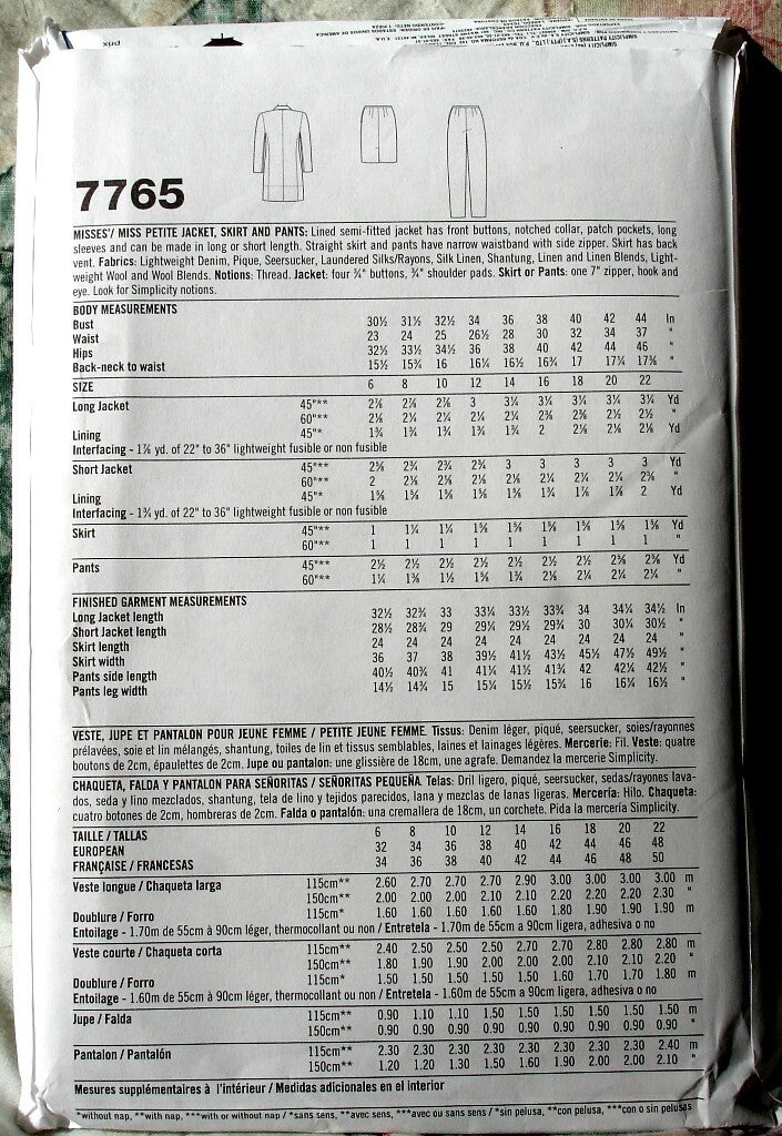 sewing pattern, Simplicity 7765, Size P makes (12-16), misses jacket, skirt, pants, lined semi-fitted jacket with front buttons, notched collar, patch pockets, long sleeves, short length sleeves, straight skirt, pants with narrow waistband and side zipper, skirt with back vent, Two Artisan Sisters,