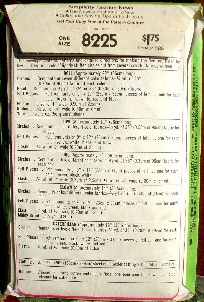 This Simplicity 8225 YoYo Doll Owl Dog Clown Caterpillar Toy Package Pattern will ship USPS First Class with tracking.