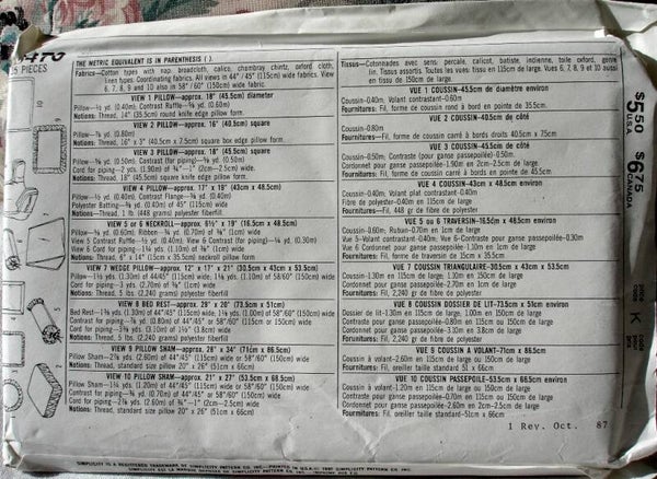 This great vintage Simplicity 8470 makes a wonderful variety of pillows and shams including an 18" round, , 16" square, 18" square, 17" x 18", 6-1/2" x 19" neckroll, 12" x 17" x 21" wedge pillow, 29" x 20" bed rest pillow as wells as 28" x 34" pillow sham and a 21" x27" pillow sham.