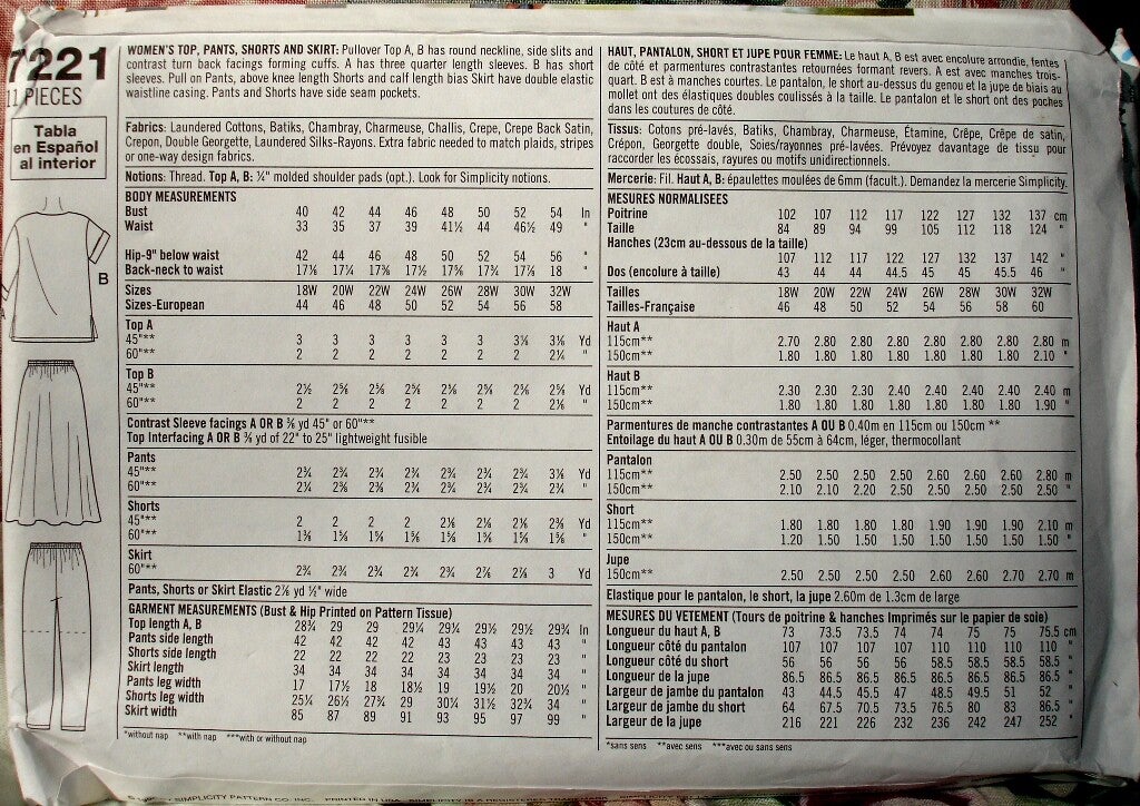 sewing pattern, Simplicity 7221, Size GG(26W-32W), women's top, women's pants, women's shorts, women's skirt, pullover top, round neckline side slits, contrast turn back facings forming cuffs, three quarted length sleeves, short sleeves, above knee length shorts, calf length bias skirt, Two Artisan Sisters,