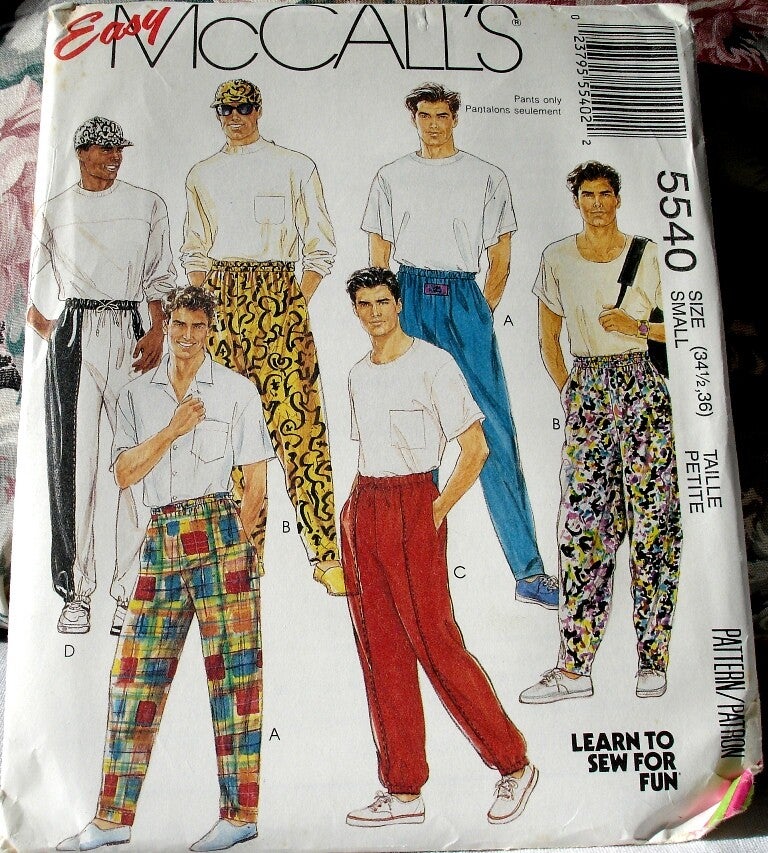 sewing pattern, novelty pants, men's pants, teen boys pants, hat, loose fitting, pull-on novelty pants, side seam pockets, low crotch, elastic waistline, drawstring inside, McCall's 5540 pattern, copyright 1991, Two Artisan Sisters,