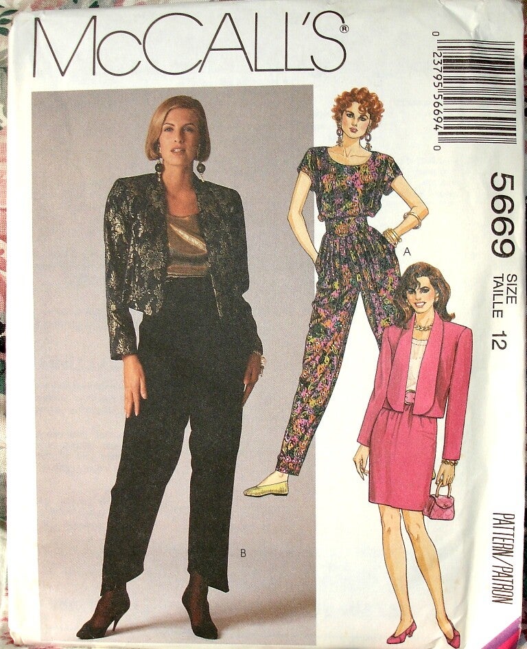 sewing pattern, McCall's 5669, misses unlined jacket, jacket with shawl collar, slightly forward shoulder seams, shoulder pads, back waistline darts, loose fitting pullover top has cap sleeves, pull-on slightly pegged skirt in above knee length, sides seam pockets, very loose fitting pull-on pants have front yoke attached to softly pleated front, back waist elastic, tapered leg with and without angled hemline,copyright 1991, Two Artisan Sisters,
