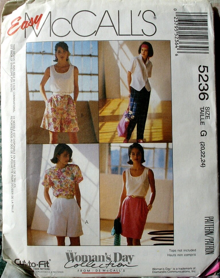 This McCall's 5236 Slightly Pegged Skirt Tapered Leg Pants And Short Size G (20-22-24) pattern will ship USPS First Class With tracking.