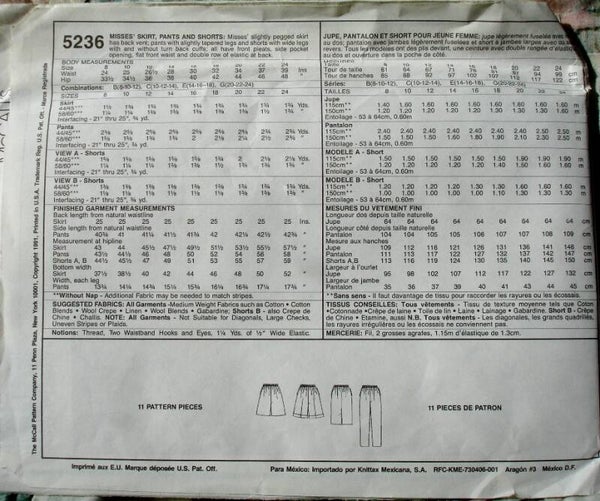 sewing pattern, McCall's 5236, misses slightly pegged skirt with back vent, pants with slightly tapered legs, shorts with wide legs, with and without turn back cuffs, front pleats, side pocket opening, flat front waist, double row of elastic at back, copyright 1991, Two Artisan Sisters,