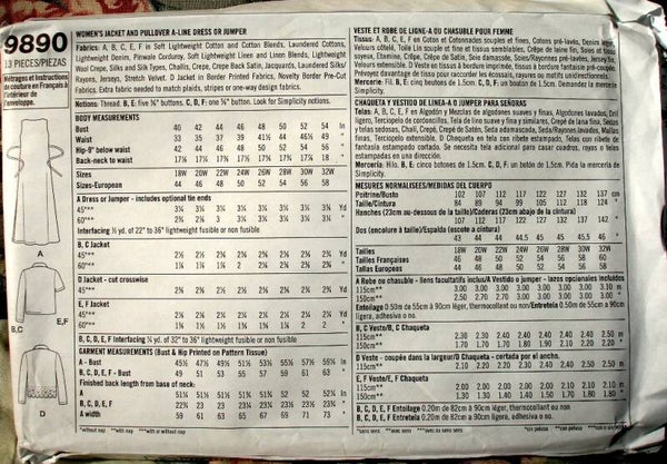 sewing pattern, Simplicity 9890, Sizes 26W to 32W, Women's jacket with long or short sleeeves, jacket with hemline variations, button front jacket, pullover a line dress, misses jumper can be made with or without tie back, raised empire waistline, womens jacket with notched collar, copyright 2001, Two Artisan Sisters,