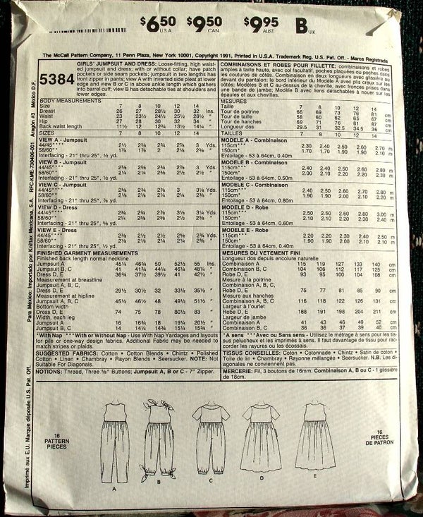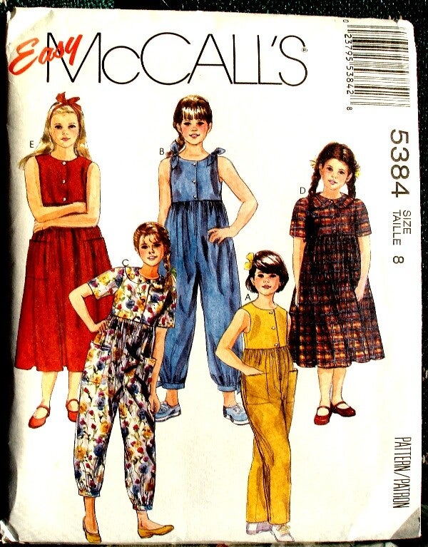 Relevent Tags: sewing pattern, McCall's 5384, Size 8, girls loose fitting high waisted jumpsuit, girls loose fitting high waisted dress, with or without collar, patch pockets, side seam pockets, jumpsuit in two lengths, jumpsuit has front zipper in pants, above ankle length which gathers into barrel cuffs, detachable ties at shoulders and lower edges, copyright 1991, Two Artisan Sisters.
