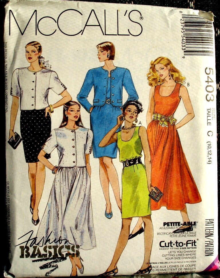 Relevent Tags: sewing pattern, McCall's 5403, Size C(10-12-14), misses unlined jacket falls slightly below waist, misses dress pattern, long or short sleeves, vent and button trim, shoulder pads and optional flaps, semi fitted bodice is gathered to a darted straight skirt, vent at hemline, sewn to a four gored skirt with waitline casing, back zipper, side seam pockets, copyright 1991, Two Artisan Sisters,