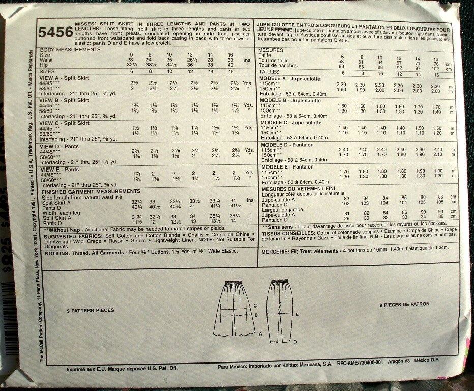 Relevent Tags: sewing pattern, McCall's 5456, misses split skirt, misses pants, Size 14, loose fitting split skirt in three lengths, pants in two lengths, front pleats, concealed opening in side front pockets, buttoned front waistband, fold back casing in back with three rows of elastic, pants have low crotch, copyright 1991, Two Artisan Sisters,