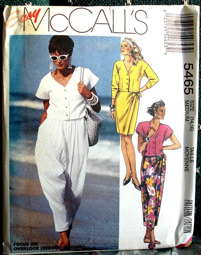 Relevent Tags: sewing pattern, McCall's 5465, size medium (14-16), misses semi-fitted slightly below waist length top, top with front and back darts, top with long or short sleeves, mock warp skirt with front and back darts, skirt with self-bias facing at waist, very loose fitting pull-on pants, fold back waistine casing with elastic, side seam pockets, low crotch, tapered legs, copyright 1991, Two Artisan Sisters,