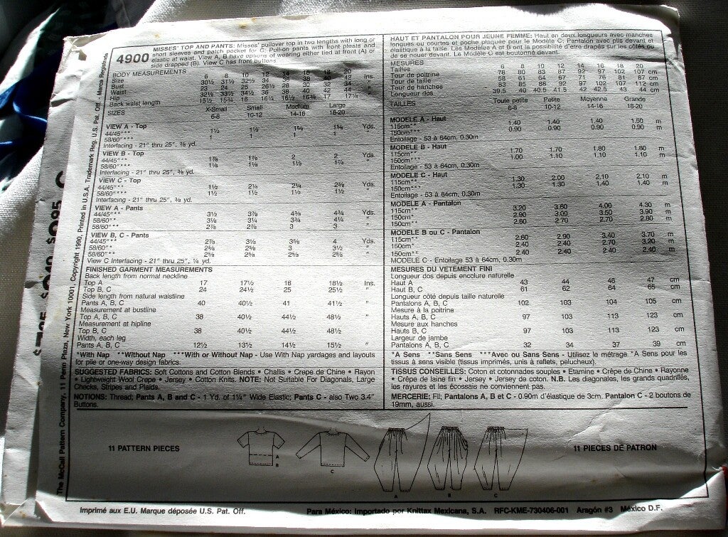 McCall's 4900 contains 11 pattern pieces which are uncut and factory folded along with the instruction sheets. Copyrighted in 1990.