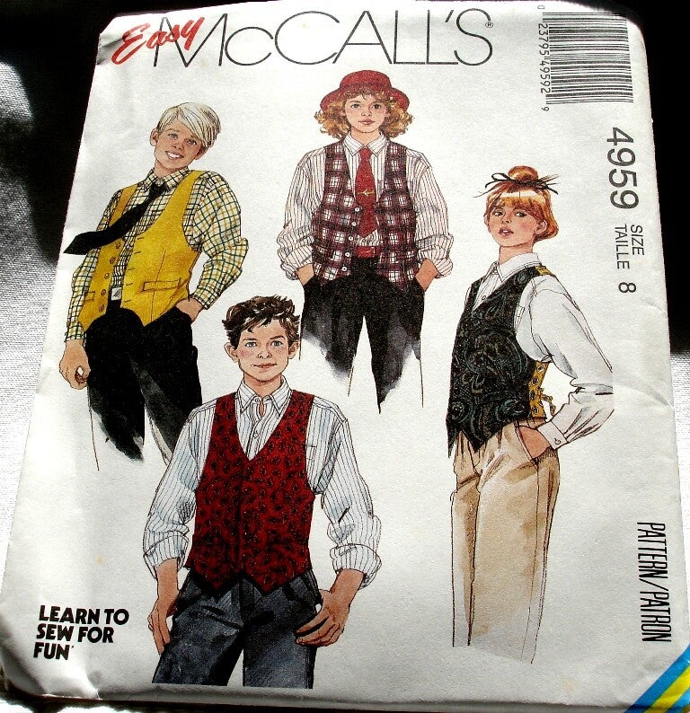 Relevent Tags:sewing pattern, McCall's 4959, Size 8, boy and girls lined vest, front buttons, bodice darts, contrast back with belt and d-ring, fake welt pockets, loose fitting shirt with front buttons, back yoke, shaped hem, patch pockets, copyright 1990, Two Artisan Sisters,