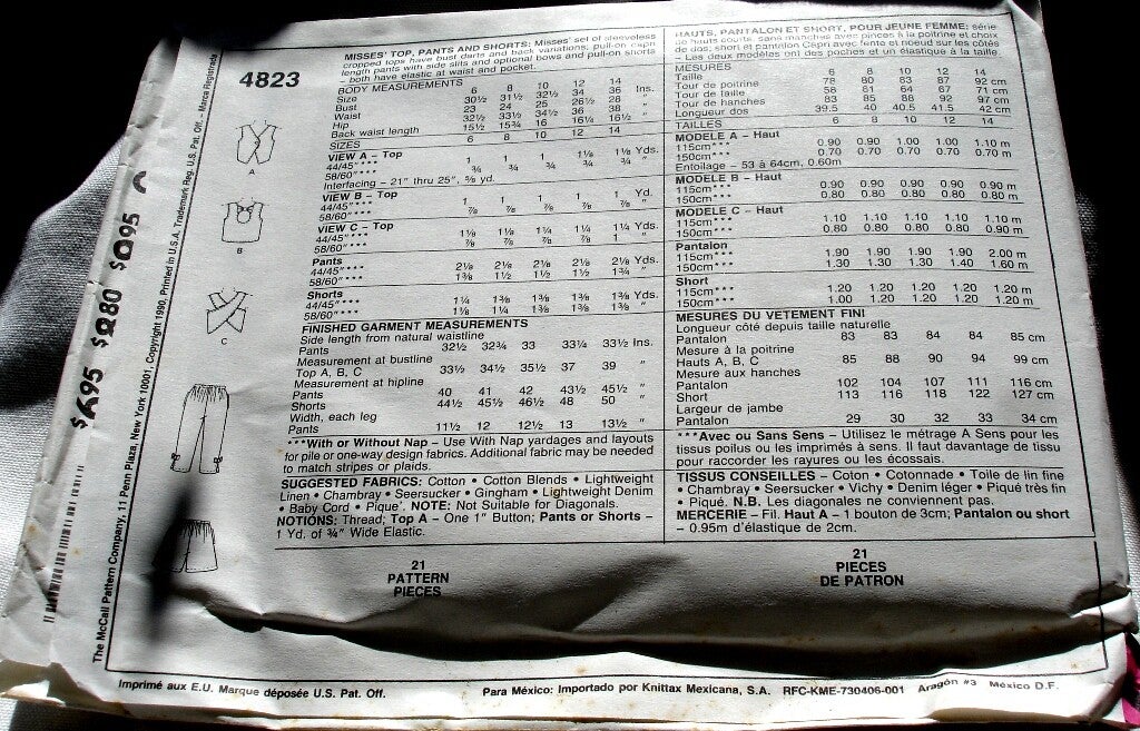 Relevent Tags: sewing pattern, McCall's 4823, Size 10, misses crop top, capri pants, pull-on shorts, sleeveless crop tops with bust darts, back variations, pull-on capri length pants with side slit, elastic at waist, pocket, copyright 1990, Two Artisan Sisters,