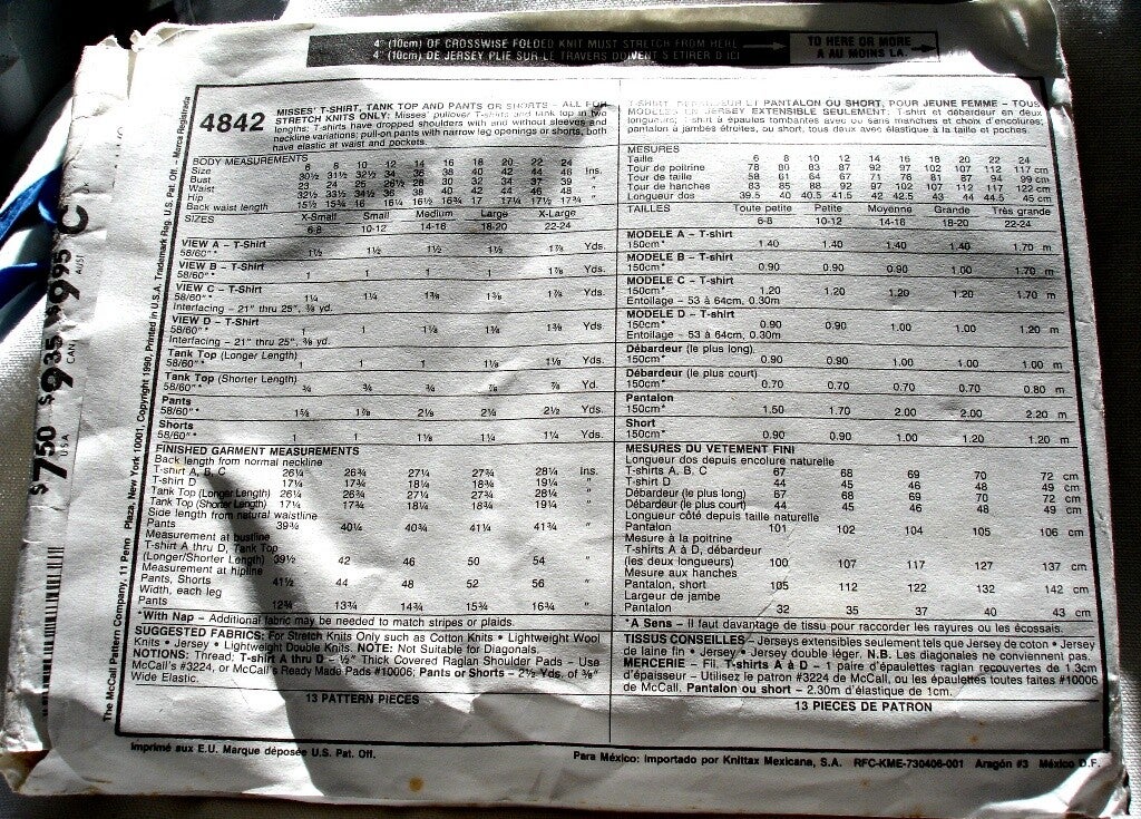 Relevent Tags: McCall's 4842, Size Medium (14-16), misses T shirt, tank top, pants, shorts, pullover T-shirt, tank top in two lengths, T- shirt has dropped shoulders with or without sleeves, neckline variations, pull-on pants with narrow leg openings, pull-on shorts, elastic at waist and pockets, copyright 1990, Two Artisan Sisters,