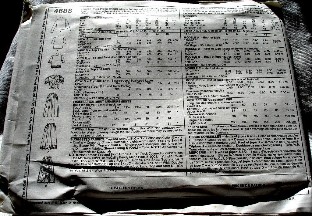 Relevent Tags: sewing pattern, McCall's 4688, Size C(10-12-14), misses two piece dress, cropped top, front u neckline, pullover, button front, long or short sleeves, short sleeve variations, pull-on full skirt, elastic at waist, underline skirt with lace, copyright 1990, Two Artisan Sisters