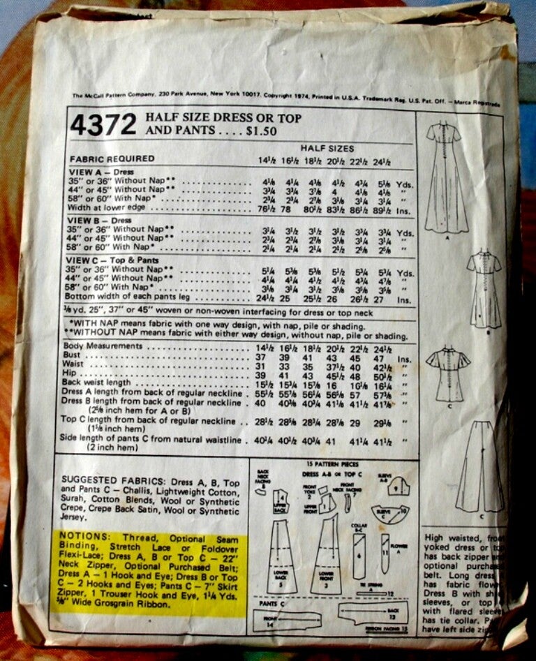 This McCall's 4372 pattern makes a Half Size Dress or a Top and Pants. It is high waisted, front yoked dress or top with a back zipper. The long dress has a fabric flower. The short dress has short sleeves or the top with flared sleeves has a tie collar. Pants have a left side zipper. This is a “Pounds Thinner” pattern vintage 1974. This would make a lovely evening dress or prom gown. Envelope has some writing on it from previous owner and shows some yellowing but in general it is in very good condition for its age.