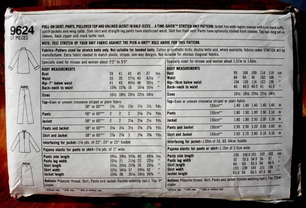 This Simplicity 9624 vintage pattern makes a pull-on skirt, pants, pullover top and unlined jacket. This is a time saver stretch knit pattern. The jacket has wide raglan sleeves with turn-back cuffs, patch pockets and wing collar. Slim skirt and straight-leg pants have elasticized waist. Skirt has front vent. Pants have optionally stitched front creases. Top has long set-in sleeves, back zipper and mock turtle neck.